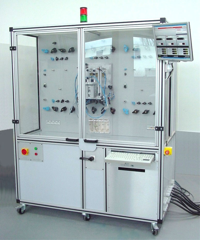 This equipment is testing the life time on and off switching capability of switches, relay and contactors. Therefor the voltage, current and cos phi can be adjusted. For all three phases those parameters are defined in a parameter database. The regulation of those parameters is working automatically. For each phase there is an one load bank. This load bank consist out of resistors and air coils. Both parts are placed inline. The resistors are controlled by semiconductors. They are adjusted between each cycle. The coils don´t need to be adjusted while the cycle is running. They are only regulated at the beginning for some cycles. The coils need to be bridged by contactors. The cos phi can be regulated in the range of 0.3 to 1.0.